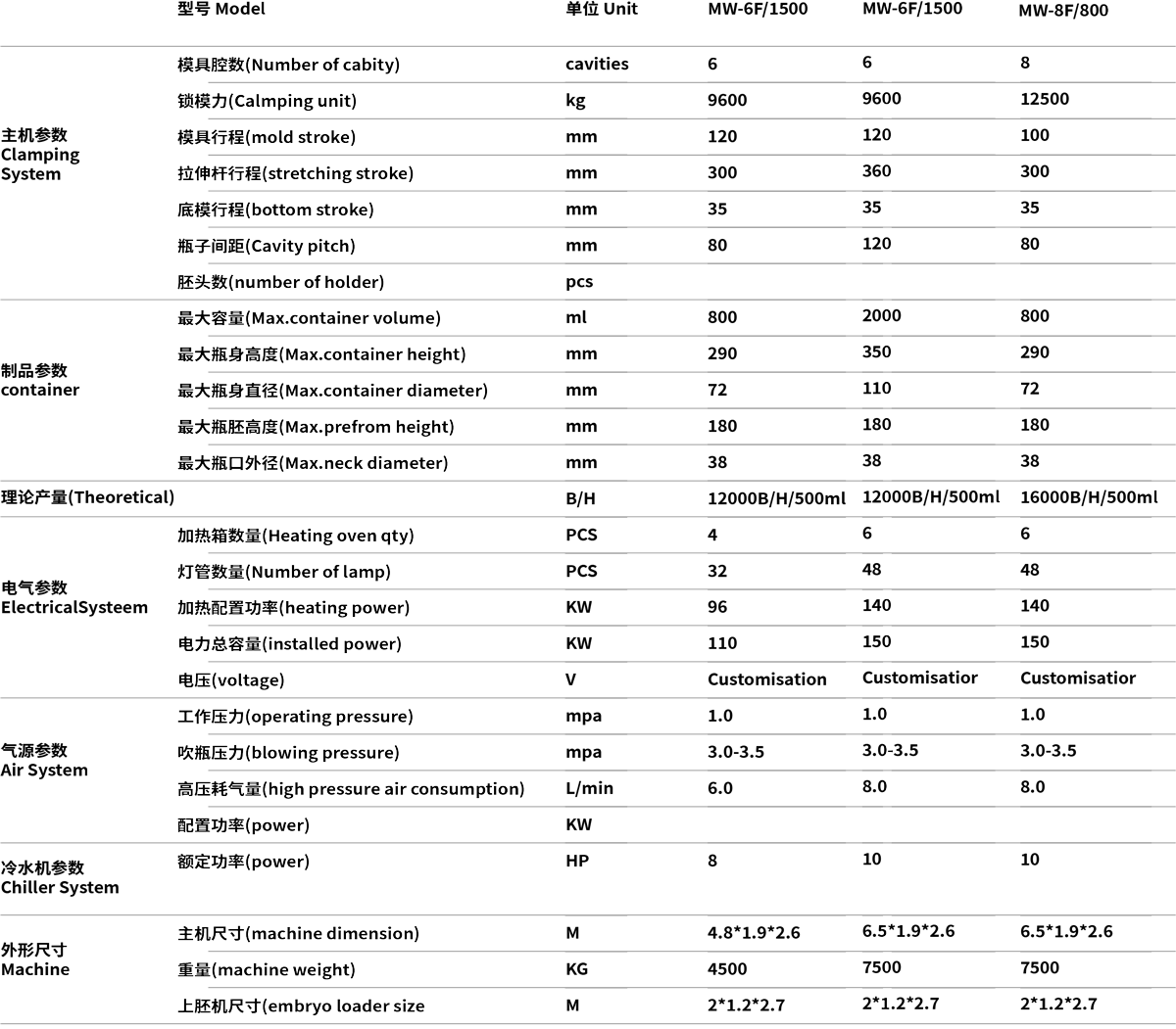 采用伺服電機(jī)驅(qū)動(dòng)環(huán)形鏈條; 采用伺服單通道上胚; 采用鋁合金制造的高壓吹氣組合閥,可有氣體回收裝置,減少能源消耗,保護(hù)環(huán)境; 采用PID恒定控制烤箱瓶胚加熱和風(fēng)機(jī)排風(fēng)。